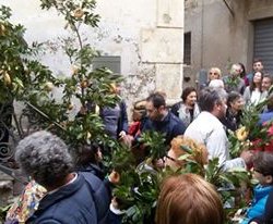 Ignazio Buttitta in una pubblicazione sulle “Feste dell’alloro in Sicilia” scrive in merito alla festa di Naso: “sabato successivo la Domenica di Pasqua, si celebra ancora, seppure con minore partecipazione di fedeli, l’antica processione dell’alloro, ricordata dai vecchi come“memorabile”, richiamo di genti da tutte le campagne circostanti e dai paesi limitrofi. Un cenno al rito rinveniamo in Pitrè : «In Naso la mattina del 1° sabato dopo Pasqua, molte persone, precedute da un suonatore di tamburo, vanno a tagliare grossi rami d’alloro nelle vicinanze d’un lontano torrente, il quale perciò viene detto: ’u vadduni ’u ’dàuru. A quei rami attaccano fettucce, pagnotte, melarance, altri ninnoli, e con essi alle mani, nelle ore p. m., accompagnano la Madonna delle Grazie, che lascia la sua chiesa per andare a passare 9 giorni nella Cattedrale. È una processione che fa piacere a vedersi, ma quando finisce, succede sempre un gran baccano, perché tutti vogliono un ramoscello di quell’alloro per portarselo a casa» (1889: 255). Giuseppe Pitrè e Carlo Incudine, storico locale di fine Ottocento, danno testimonianza della festa così come si conserva ancora nel malinconico ricordo degli anziani. Molto del calore del rito si è perduto; la partecipazione popolare è progressivamente venuta meno, e la gente che si recava in pellegrinaggio presso l’antica chiesa della Madonna, non è più numerosa come una volta. Ci troviamo di fronte ad una tradizione in “estinzione”. Coloro che partecipano al rito, tuttavia, manifestano una volontà molto viva di restare a esso fedeli e di poter ridare vita a quella che un tempo era una grande festa. La mattina del sabato alcuni appartenenti al Comitato organizzatore, costituitosi nei giorni precedenti allo scopo di reperire i fondi necessari allo svolgimento della festa, si incaricano di andare a raccogliere l’alloro presso alcune località site nelle immediate vicinanze del paese. Qui vegetano rigogliosi alcuni grandi alberi di alloro, vecchi di decenni. Secondo quanto riferito da tutti gli interpellati, non si serba memoria di un unico e specifico luogo di raccolta, né l’uso di recarvisi in pellegrinaggio con l’accompagnamento dei tamburi; usi che, testimoniati da Pitrè, e probabilmente una volta più largamente diffusi, ritroviamo ancor oggi in altri luoghi (Troina, Gagliano). L’alloro, raccolto in abbondanza e suddiviso in rami più o meno grandi, viene portato all’interno di una piccola e vecchia chiesa, San Pietro, che si affaccia sul corso del paese. Lì i rami vengono addobbati con nastri, qualche fiocco e le tradizionali ciambelle di pane, dette con voce locale cuddureddi. Sia l’addobbo che la grandezza dei rami sono variati negli ultimi decenni. La memoria degli anziani attesta che, fino allo scoppio del secondo conflitto mondiale, era costume adornare riccamente rami di ben più notevoli dimensioni, “arvuli sani” (interi alberi). Svettavano al cielo verdi chiome adorne di nastri rossi e di altri colori, arance, fazzoletti, oltre naturalmente ai pani. Gli “alberi” risultavano talmente pesanti che, per il trasporto processionale, era necessario aiutarsi con una larga e robusta fascia di stoffa o di cuoio che, girata dietro la nuca, offriva al ramo un supporto all’altezza del ventre. Il trasporto di questi rami era una gara. Chi fosse riuscito a portare a termine l’intero lungo percorso, tra viuzze strette e continui saliscendi, con u ddauru (questo il nome dato al ramo), con l’addobbo e le fronde in migliori condizioni, riceveva un premio costituito da beni alimentari e, in anni più recenti, anche da denaro. Oggi questa tradizione è completamente scomparsa.”